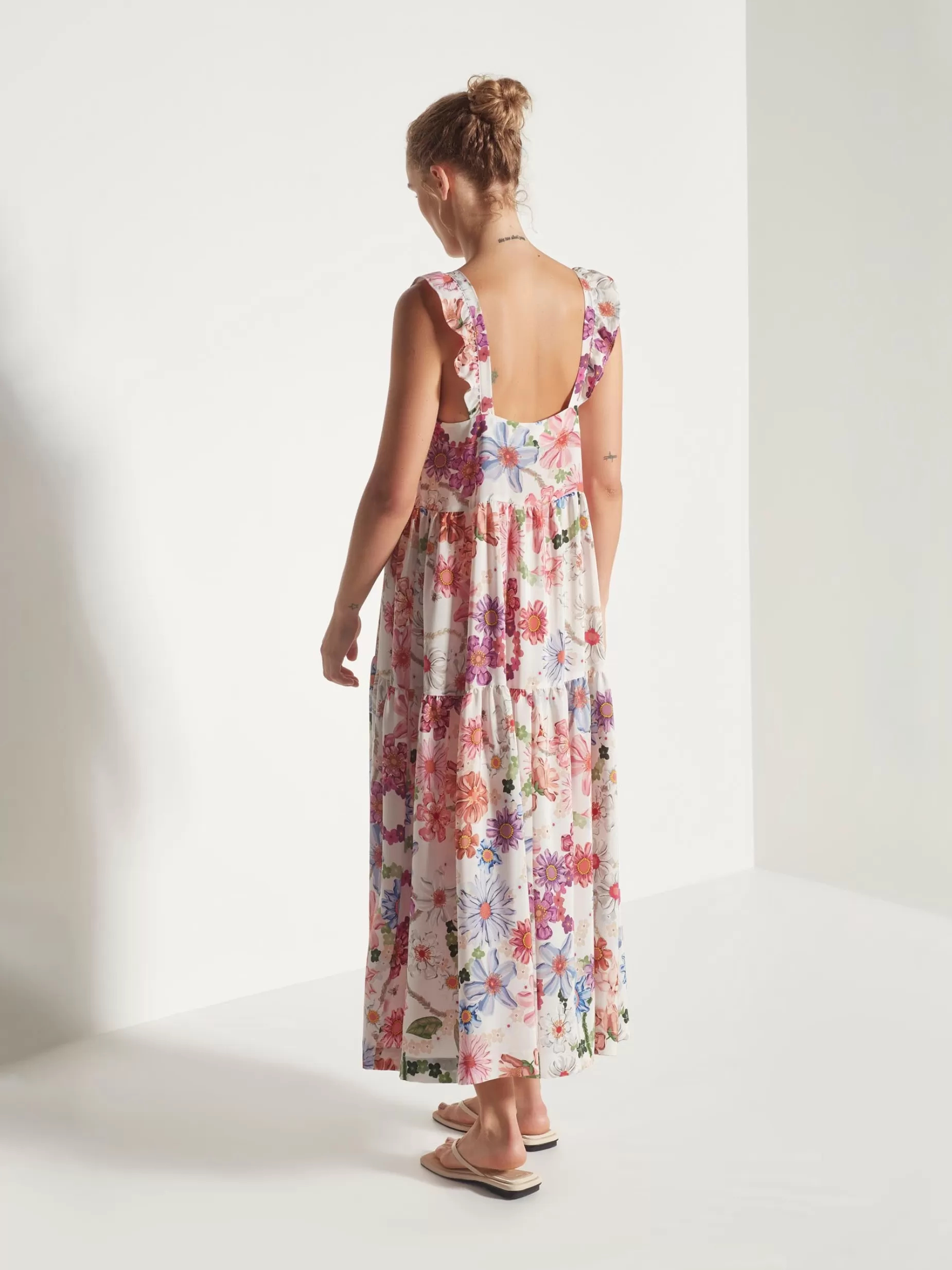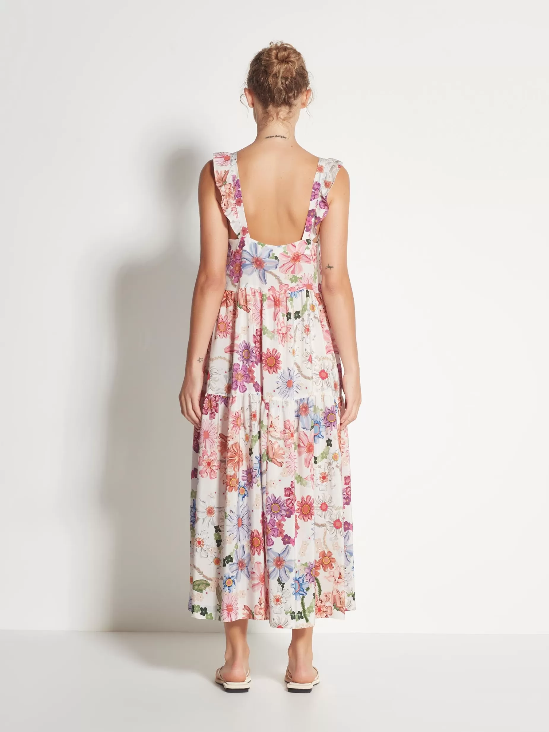 A Playful Flowy Midi Dress Style To Add To Your Summer Wardrobe In A Stunning Patterned 100% Silk. Two-Tiered Extra Volume Skirt For An Effortless Yet Flattering Fit.