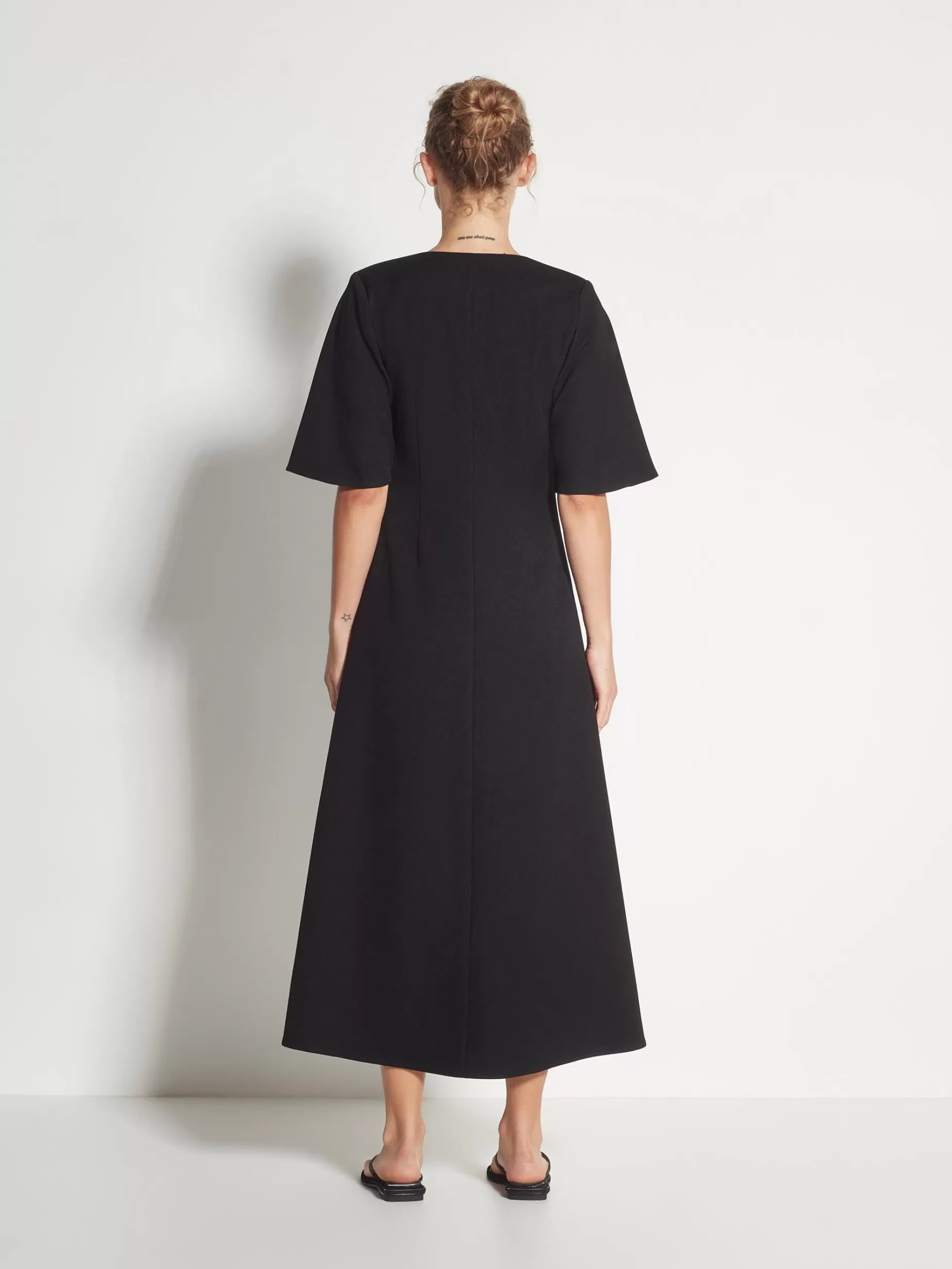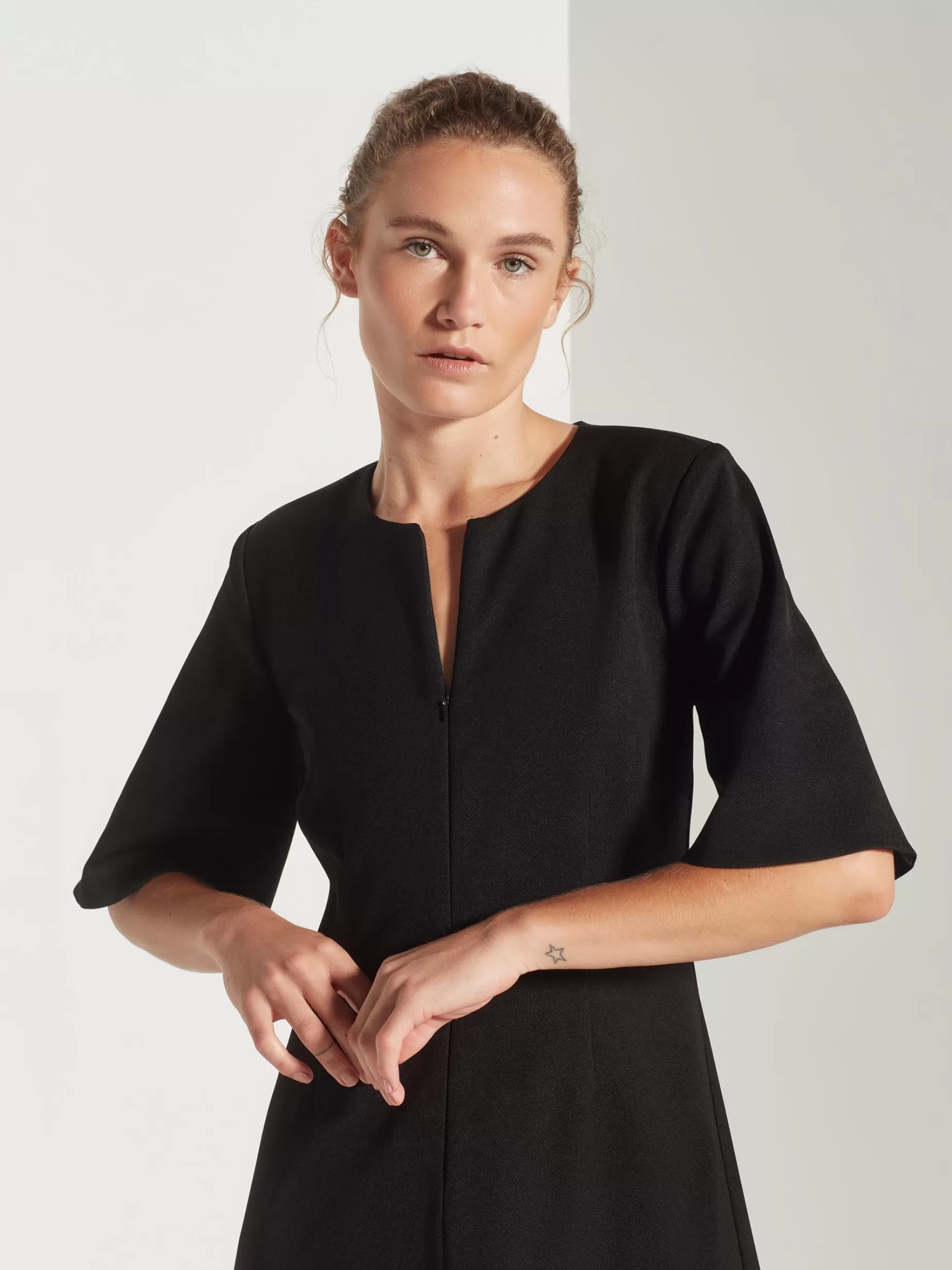 Cut From A Structured Poly Blend, This New Jh Style Falls To The Ankle. The Flinn Dress Is Tailored To Contour With The Natural Lines Of The Body. A Unique Take On A Jh Midi-Dress Style, Featuring Flarred Elbow-Length Sleeves With A Versatile Front Zip To Customise Your Look. True To Fit Round Neckine Front Zip Elbow-Length Sleeves Hem Falls To The Ankle Polly Wears A Size 8, Usually Wears A Size S/8 And Is 175Cm Tall 63% Polyester 37% Triacetate 50% Viscose 42% Polyester 8% Rayon Lining Cool Delicate Machine Wash Separately Dry In The Shade Fabric Sourced Through Wall Fabrics Proudly Made In New Zealand By Jm Productions