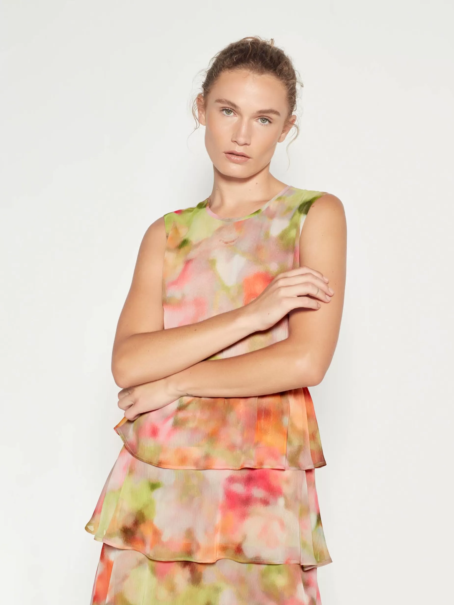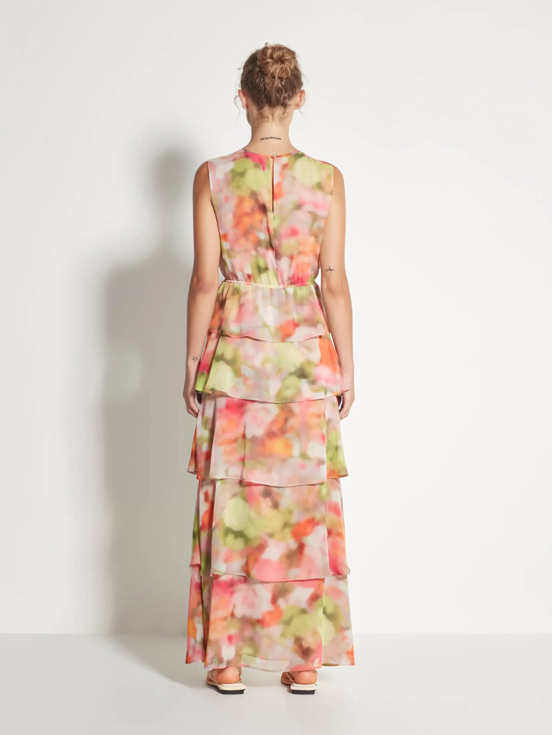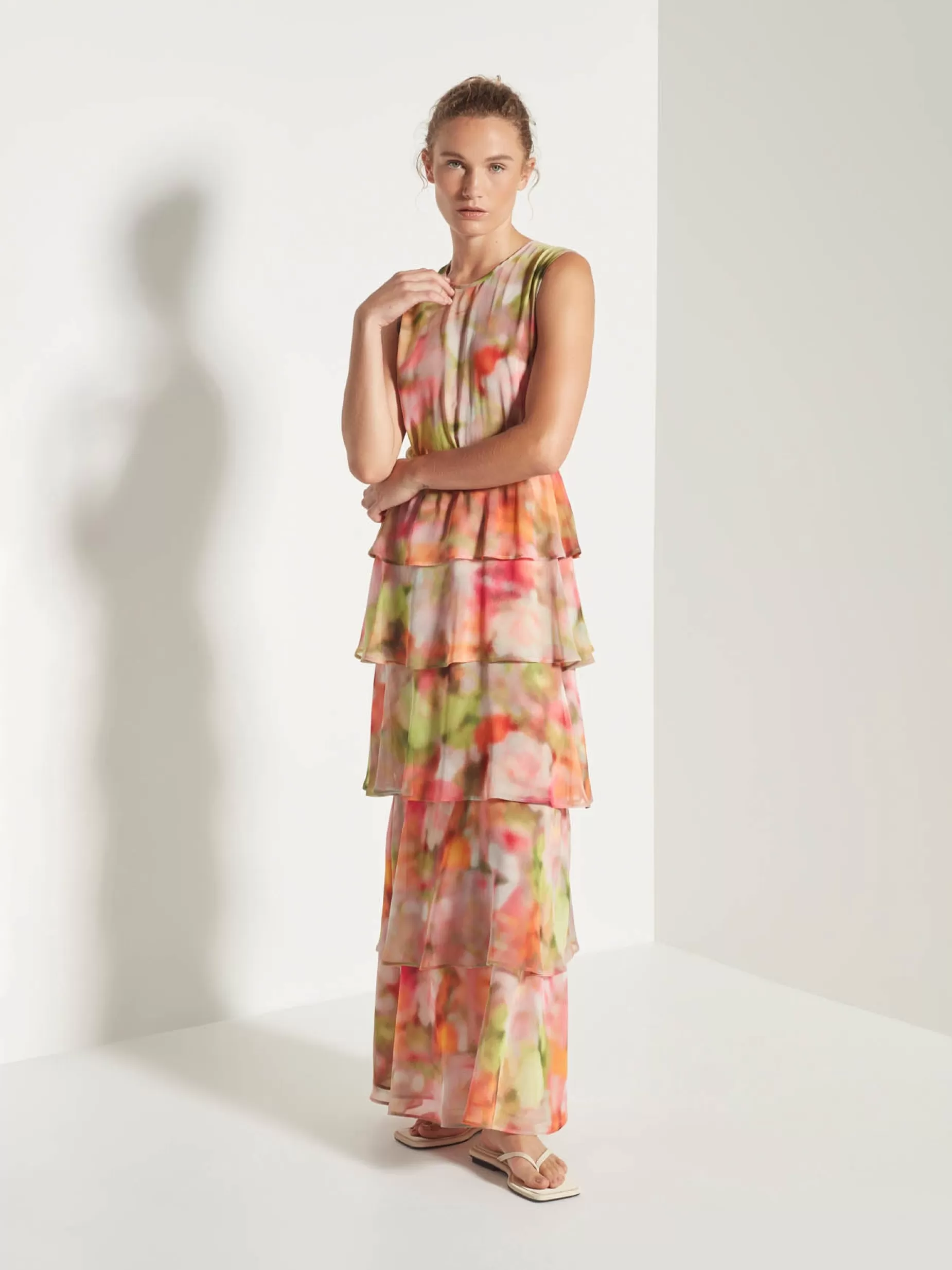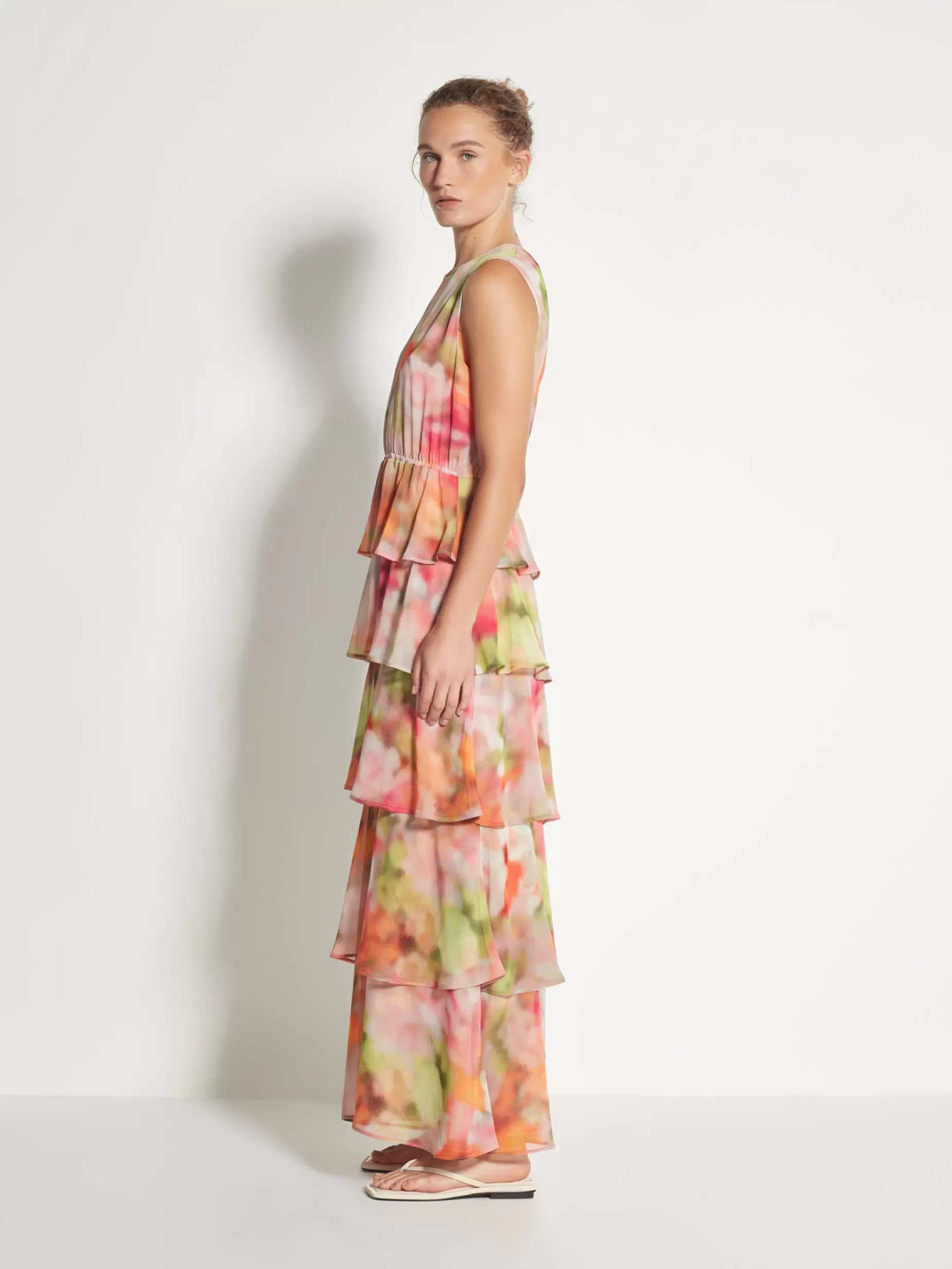 The Magdalena Dress Is A Feminine Style, Featuring A Simple Crew Neckline, Structured Bodice And A Waterfall Tiered Full-Length Skirt. A Bold Silhouette In A Vibrant Spring-Toned Watercolour Spring Crush Print. Cut From A Light And Fluid Recycled Polyester Flowing Elegantly Down The Tiered Skirt To Create Movement.