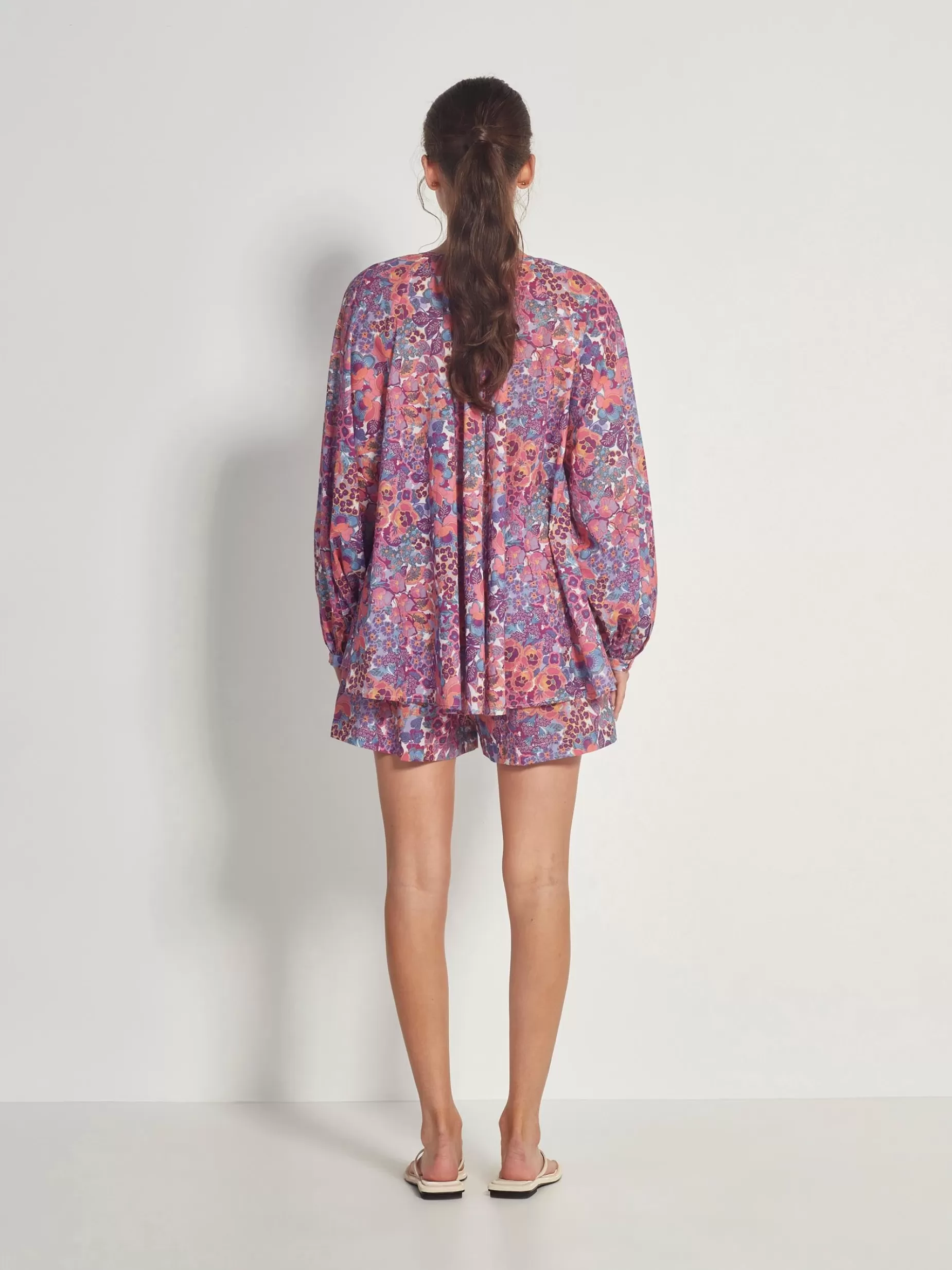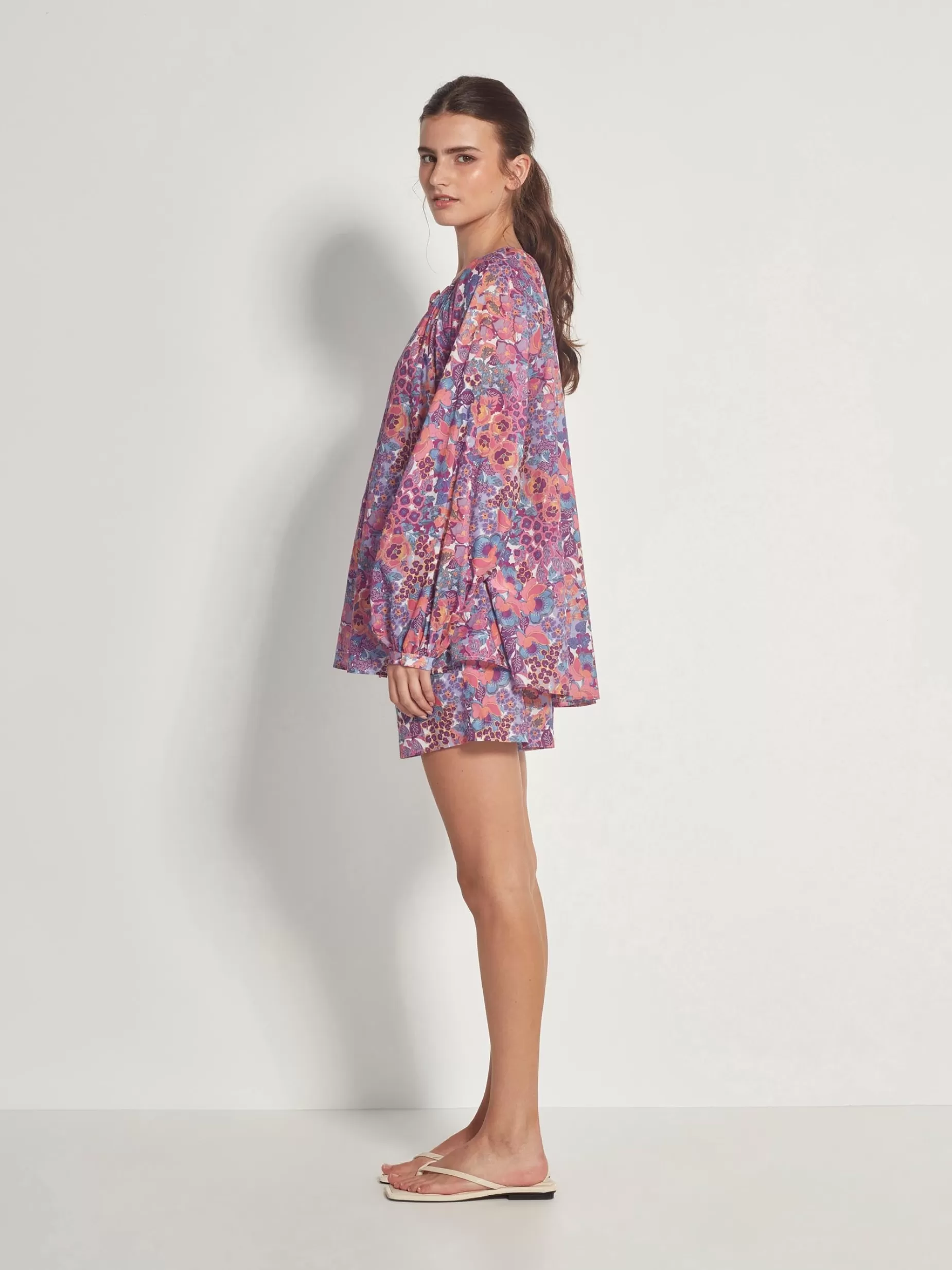 A New Jh Style, The Orion Shirt Is A Relaxed Collar-Less Shirt, Featuring A Flowy Scoop Hem, Gathered Raglan Sleeves, And An Exposed Button Placket. Crafted In Our Custom Garden Party Cotton To Add A Splash Of Colour To Your Summer Wardrobe. Jh Custom Print DesignCollar-Less Loose ShirtScoop HemGathered Raglan SleeveElla Wears A Size 8, Usually Wears A Size S/8 And Is 176Cm Tall 100% CottonCool Gentle Machine WashHang To Dry In ShadeDry Clean With CareFabric Sourced Through Deveaux SasProudly Made In New Zealand By Jm Productions