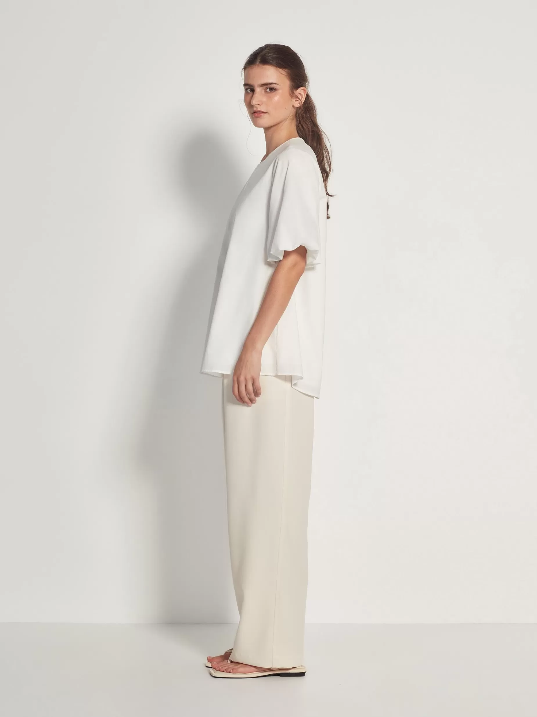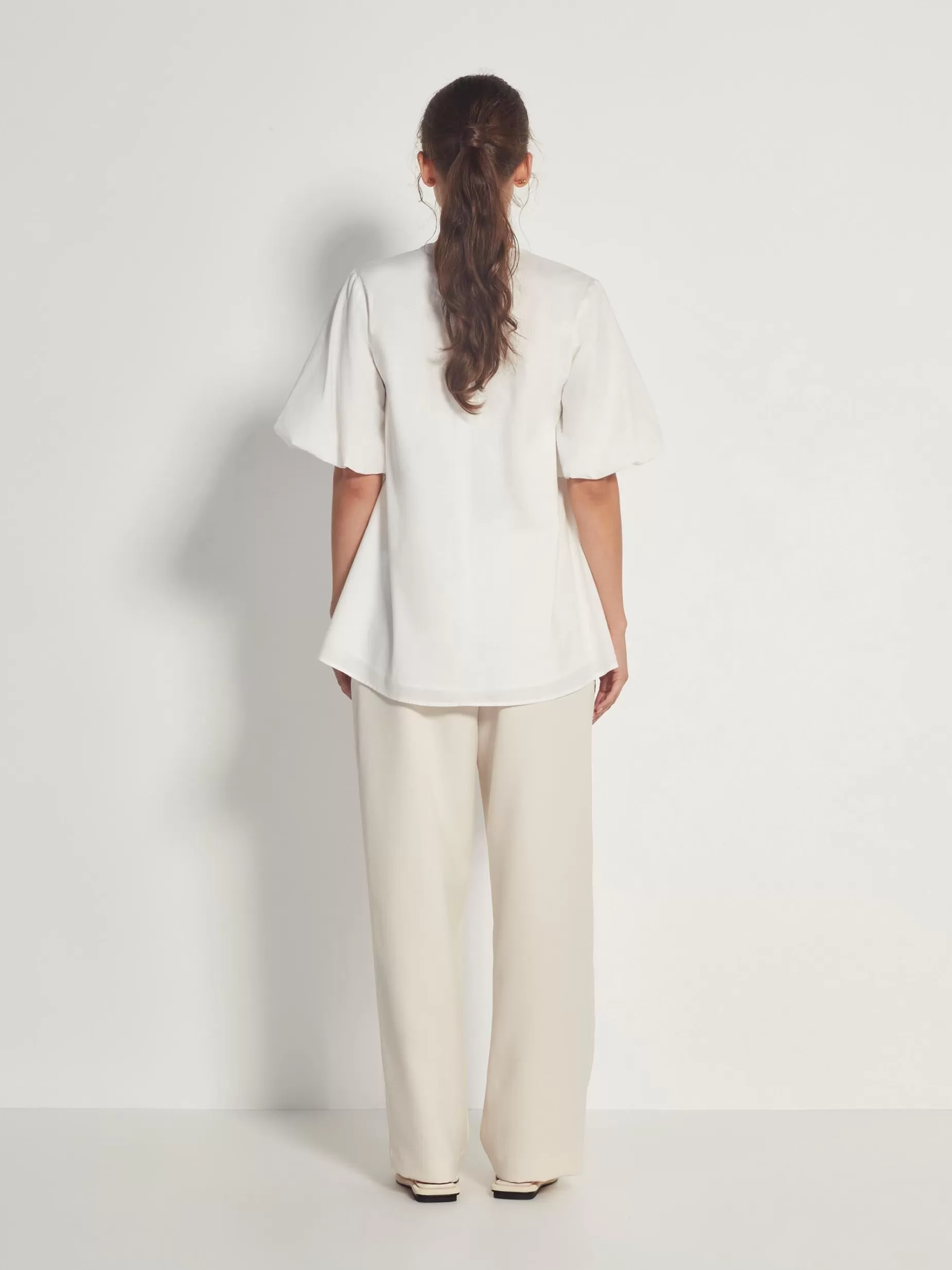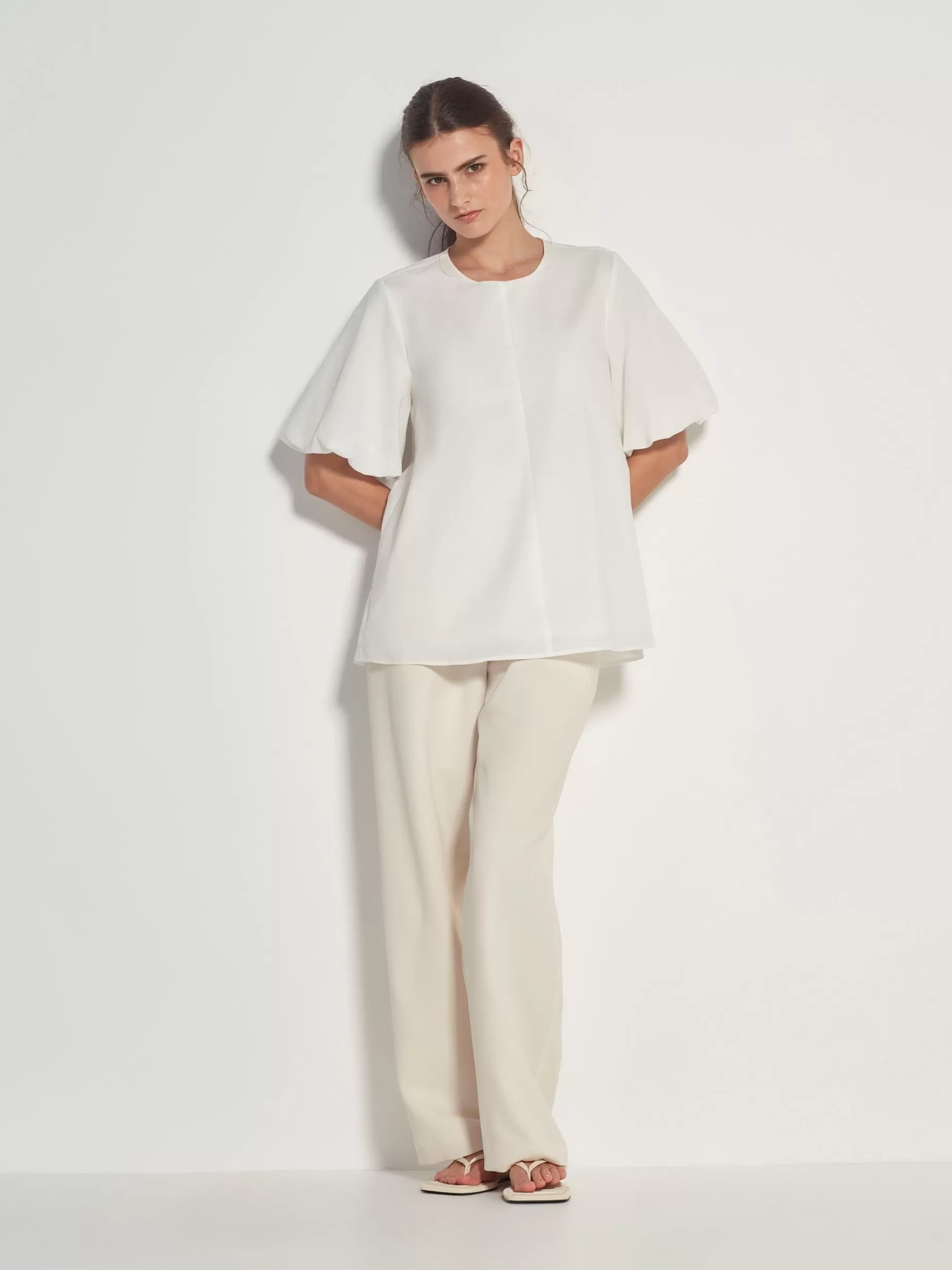 The Quinn Top Is A New Effortless Style Featuring A Gathered Elbow-Length Puff Sleeve, A Crew Neckline And A Scooped Hem. A New Classic, This Elegant Top Can Be Dressed Up Or Down For All Occasions.